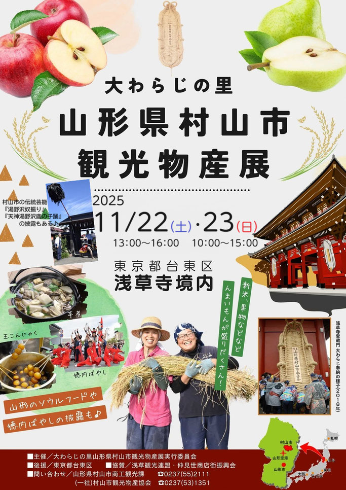 村山市の友好都市である東京都台東区。浅草寺の宝蔵門に掲げられている大わらじは、村山市の楯岡荒町地区が奉納しているものです。国内外からの大勢の観光客でにぎわう浅草寺で、村山市の観光物産展を開催します。物産品販売のほか、「徳内ばやし」や「湯野沢奴振り・天神湯野沢鹿の子踊」の披露もあります。みなさんぜひ、お越しください。